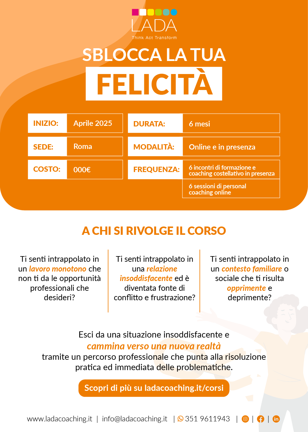Compila il form per iscriverti al corso oppure manda una email a info@ladacoaching.it.